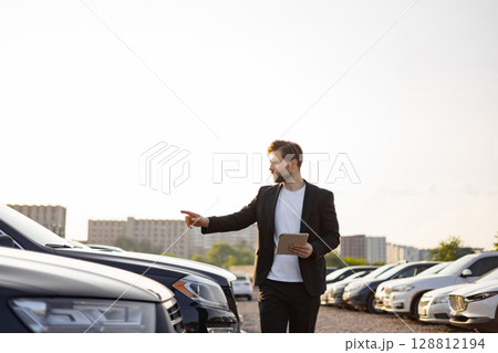 A businessman in a suit points towards a car in a parking lot, holding a tablet while reviewing the vehicles on display.