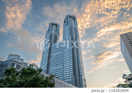 日本,新宿子中心的東京都市風景。夕陽下閃耀的東京都政府大廈的景色