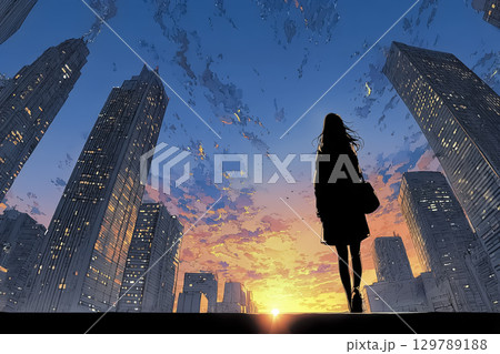 一位穿著西裝的女子走在商業區,早晨的通勤場景,陽光照射進來的城市,動漫風格