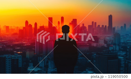 A construction worker stands on high rooftop, overlooking vibrant city skyline at sunset. dramatic clouds and warm colors create breathtaking view, evoking sense of achievement and wonder