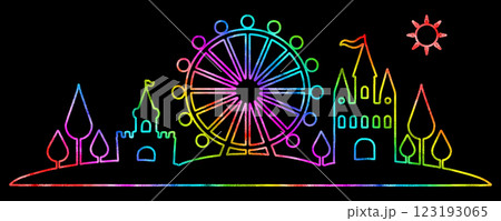 彩虹色漸層線畫遊樂園的插圖,有摩天輪和童話城堡,黑色背景上的切口
