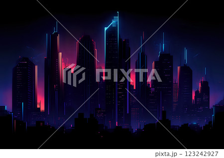 Futuristic city skyline with bright neon accents in dark atmosphere