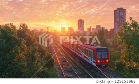 Urban Train Cutting Through Peaceful Landscape at Sunset with Elevated Perspective
