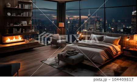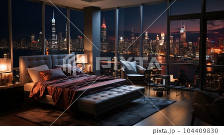Bedroom with a view of the city outside of the window, Interior of a modern apartment bedroom.