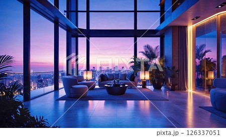 Luxurious penthouse living room with floor-to-ceiling windows showcasing spectacular purple-pink sunset over city skyline. Modern interior featuring elegant furniture, ambient lighting, and tropical