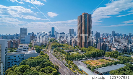 Cityscape Embraces Green Spaces and Modern Architecture Under Blue Sky with Urban Harmony.