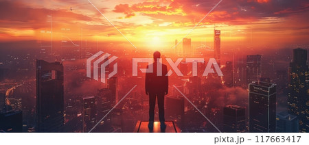 Silhouette of a man standing on a rooftop overlooking a city skyline at sunset.