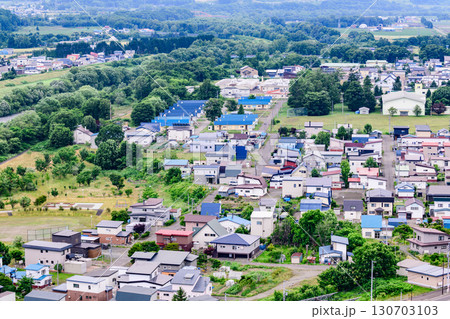 眺望日本海和夏日天空的瓦片屋頂村莊