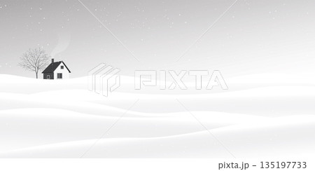 Minimalist snowscape with lonely country house on the hill covered by white snow have dusk sky background graphic illustration.