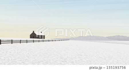 Minimalist snowscape with farmland have mountain ranges and vanilla sky background graphic illustration.