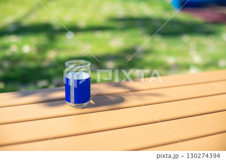 長椅上放著一杯清酒