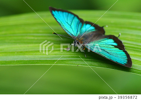一隻藍胸水蝶停在一片葉子上