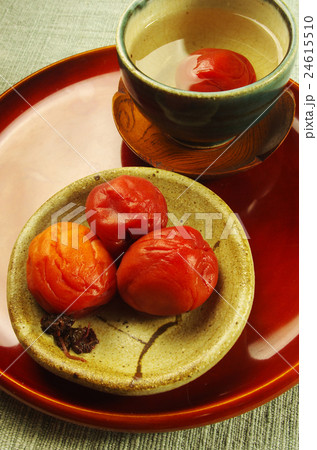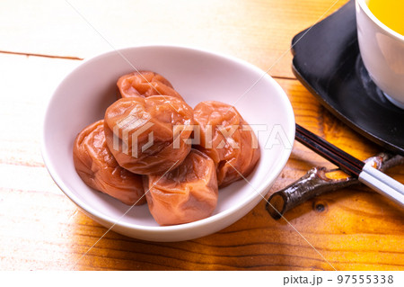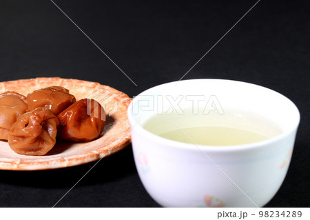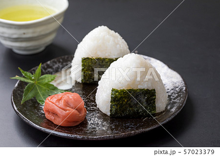 與米飯糰,李子醃汁和茶的日本米拷貝空間在黑背景