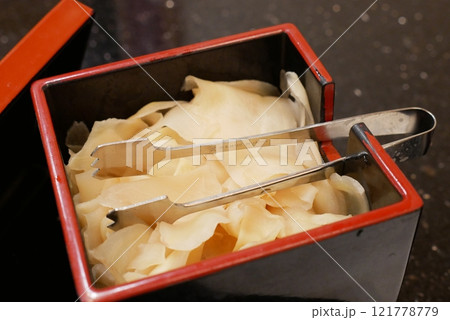 壽司不可或缺的加里。生薑浸泡在木製壽司木屐上的糖醋汁中。