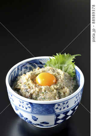 拍攝了在白色背景上擊打大量竹莢魚製成的當地菜餚的 namero