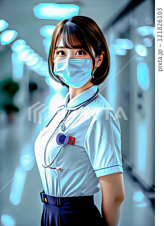 在醫院工作的年輕女性 戴著口罩的醫院女性 醫療辦公室 [AI 生成圖像]