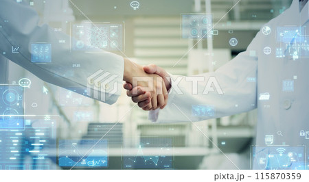 穿白大褂的人們握手和數位數據