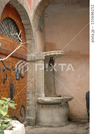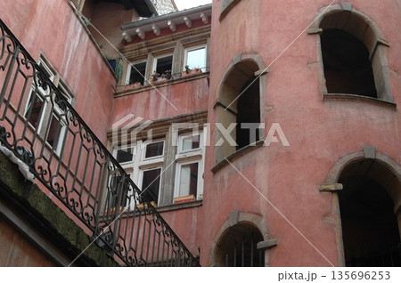 Lyon, france. December 29, 2023. Looking up a historic vieux lyon traboule courtyard with ornate renaissance facades and ancient spiral staircases reaching to the sky