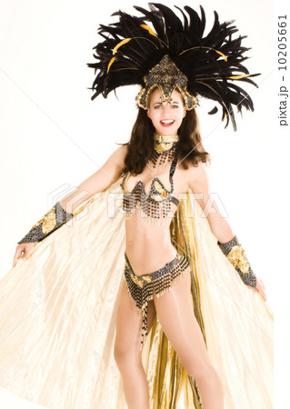 Woman in brazilian samba carnival costume with colorful feathers plumage