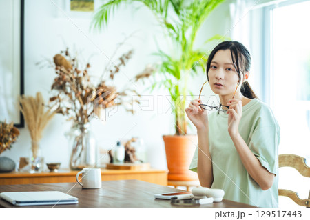 特寫鏡頭:一位微笑的女人摘下眼鏡