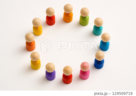Wooden peg figurines in a colorful gradient arranged in a partial circle to promote diversity, equity, and inclusion