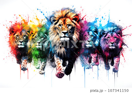 Image of herd of colorful lions on white background. Wildlife Animals. Generative AI, Illustration.