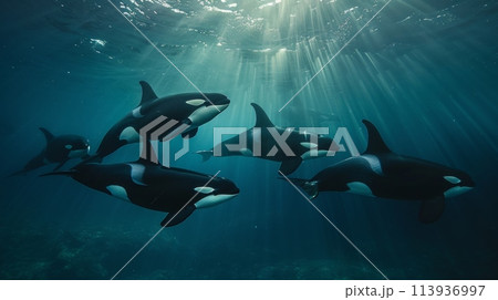 Orcas killer whales underwater in dark sea.
