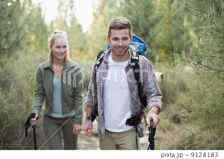 Composite image of rear view of female hiker carrying backpack standing with hands on hip