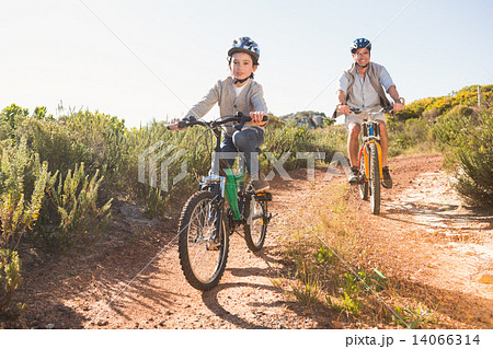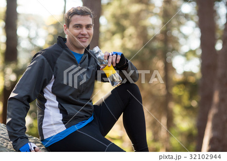 Man standing on pine forest trail wearing cycling helmet beside mountain bicycle under sunlight