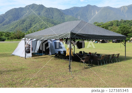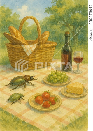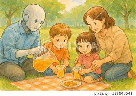 人與人相伴的家常菜和設備|親子在草地和土地上一起享用果汁