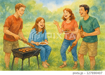 夏日陽光烤肉派對|朋友聚會歡笑光|遠野餐廳物語|烤肉與友情插畫