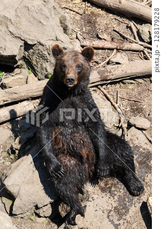 Wild Brown Bear (Ursus Arctos) sits in the summer forest. Animal in natural habitat.