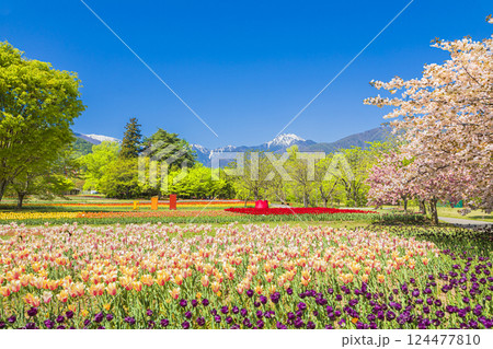 安曇野公園:鬱金香與櫻花盛開,眺望北阿爾卑斯山