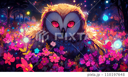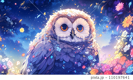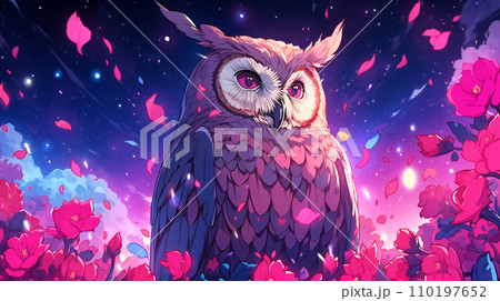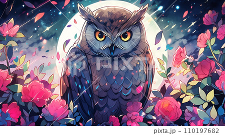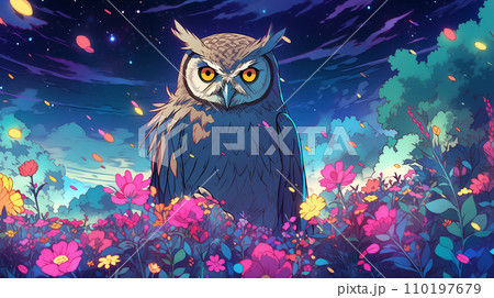 手绘卡通夜晚星空下花丛中的白头鹰插画