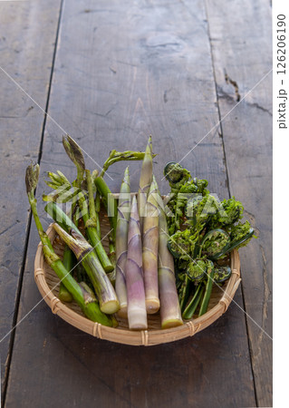 各種野生蔬菜:楤木芽、小莧菜、越紫莧菜和蜂斗菜。