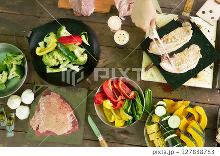 戶外餐桌上的肉類和蔬菜燒烤配料