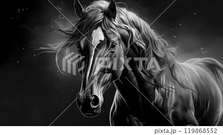 Elegant black and white illustration of a prancing stallion featuring decorative flowing lines and dramatic movement, perfect for horse logos and artistic designs in vector format.