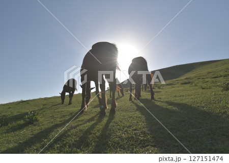 居住在土肥岬的天然紀念物三崎馬在牧場上吃草 | 馬圖片 | 宮崎縣串島市