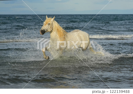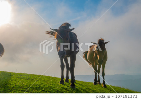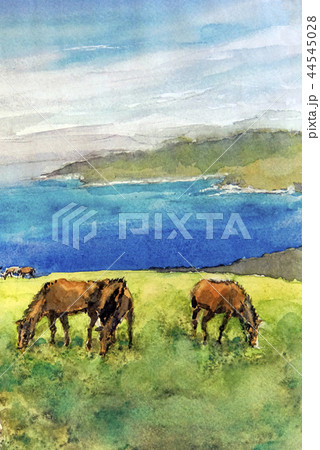 居住在土肥岬的天然紀念物三崎馬在牧場上吃草 | 馬圖片 | 宮崎縣串島市