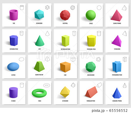 Realistic 3d geometric shapes. Basic geometry prism, cube, cylinder figures, geometric polygon and hexagon shapes vector illustration icons set