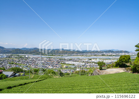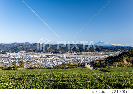 從靜岡縣島田市牧之原眺望富士山、島田市、金谷市的全景