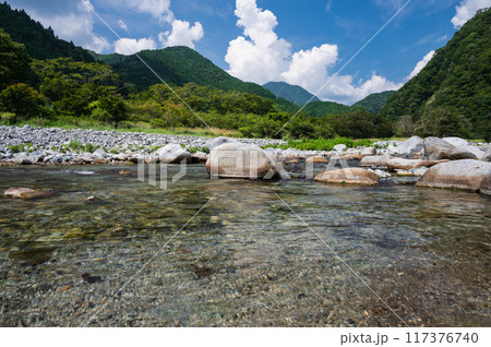 夏季山景,日本清澈的溪流,美麗的河流