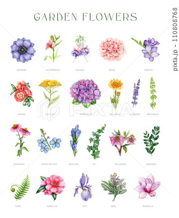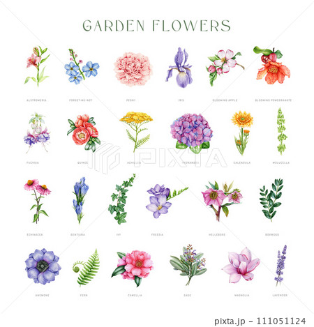 Garden flowers vintage style watercolor painted big set. Hand drawn different garden flowers painted collection. Various floral vintage style botanical element set. White background