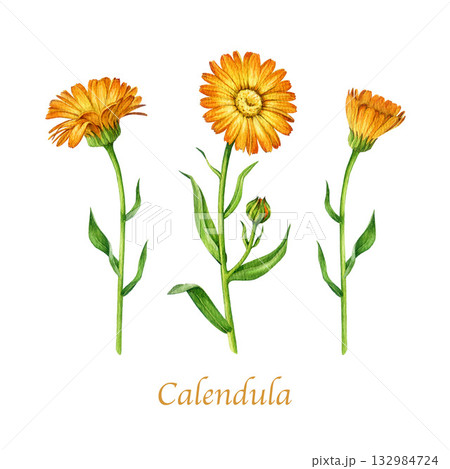 Watercolor botanical set of calendula flowers. Hand drawn illustration on isolated background, suitable for menu design, packaging, poster, website, textile, invitation, brochure, textile.