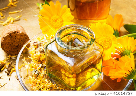 Basket of healthy calendula medicinal herbs. Marigold flowers. Bottles of calendula essential oil and infusion, fresh marigold flowers. Alternative herbal medicine.