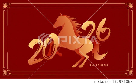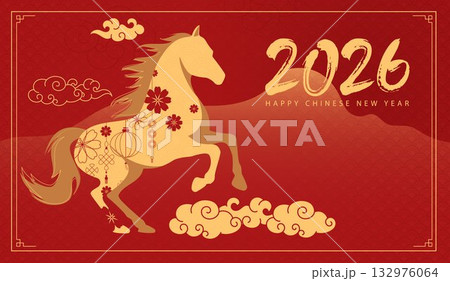 Chinese New Year 2026 celebration with golden horse zodiac, red festive background, lanterns, traditional patterns, clouds, and lucky decorations for Lunar New Year design.