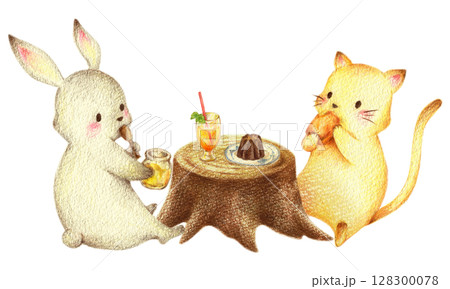 一隻兔子和一隻貓在樹樁桌旁吃糖果。手繪色鉛筆畫。
