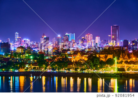 柬埔寨首都金邊、王宮和城市的河畔夜景