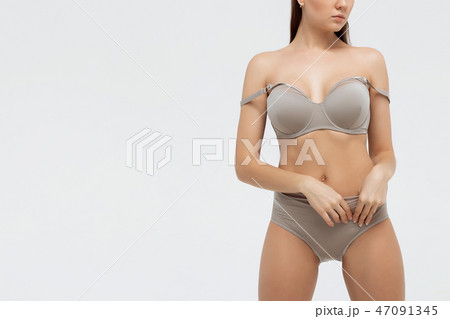 fashion model with long hair, perfect skin is posing in studio for glamour test photo shoot showing