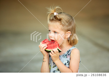 Beautifu baby girl with blond curly hair wearing a white dress p